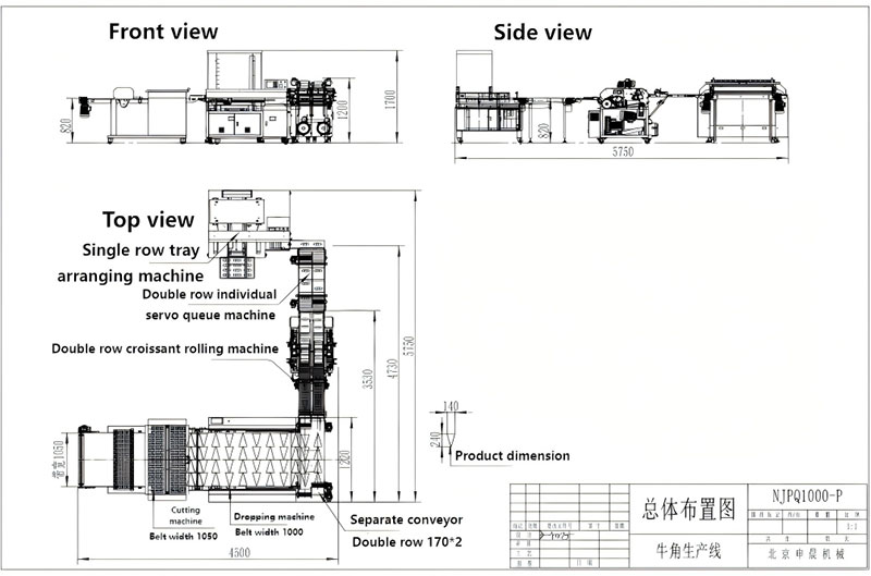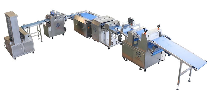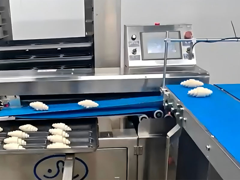 This automatic croissant production line consists of a two-roll dough sheeter, a dough sheet cutter, a dough sheet aligner & depositor, a dual-layer diverging conveyor, a dual-lane croissant forming and rolling machine, a queuing conveyor, and an optional automatic tray arranging machine.