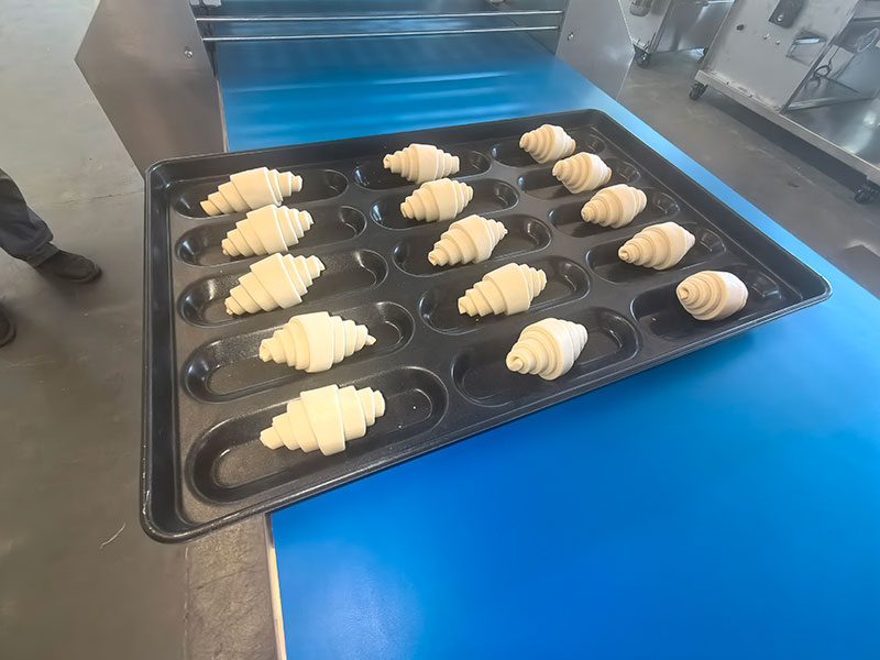 Finished croissants are automatically placed onto baking trays, reducing manual sorting and improving workflow continuity across processing stages.
