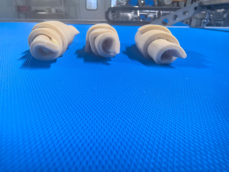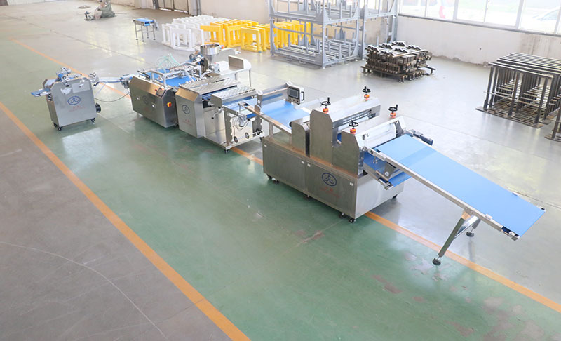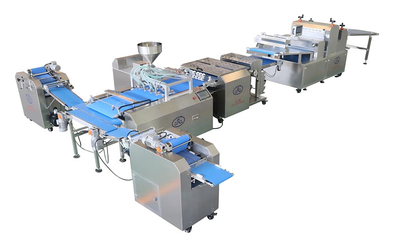 The production line consists of a multi-roll dough sheeter, a Dough sheet cutter, a dough sheet aligner & depositor, a follow-up filling unit, a left–right diverging conveyor, and two croissant forming and rolling machines.