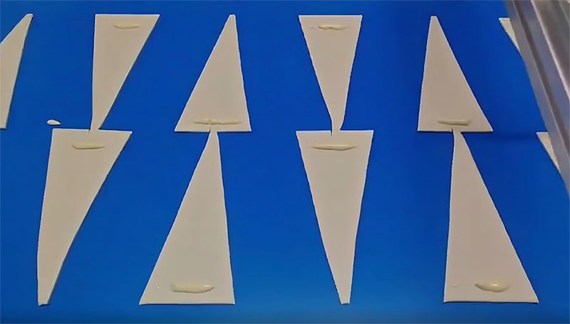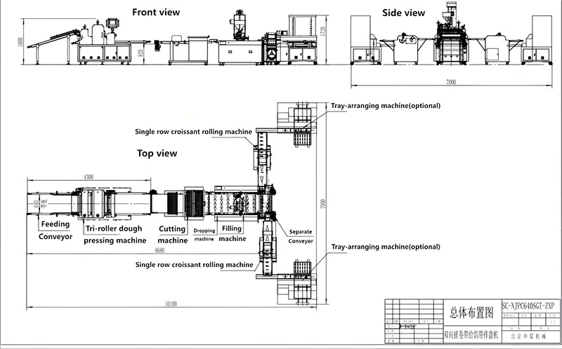 The production line consists of a multi-roll dough sheeter, a Dough sheet cutter, a dough sheet aligner & depositor, a follow-up filling unit, a left–right diverging conveyor, and two croissant forming and rolling machines.