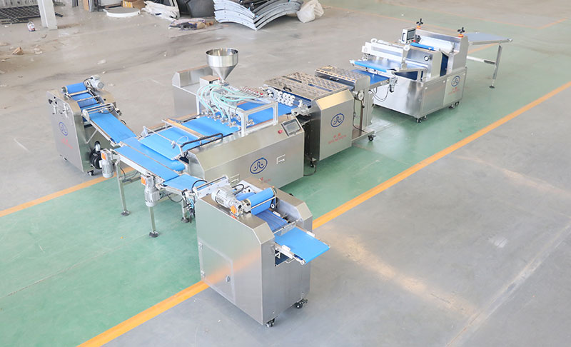 This automatic croissant production line integrates filling into the production process and consists of a three-roll dough sheeter, a dough sheet cutter, a dough sheet aligner & depositor, an in-line automatic filling machine, a left-right diverging conveyor, and two croissant forming and rolling machines. This croissant production line offers an optional fixed filling machine and features a steel-wire cutting device at the outlet to prevent stringing. Filling nozzle size and position can be adjusted by replacing the nozzle plate.